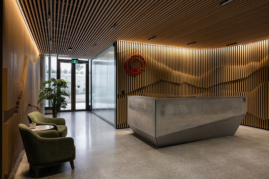 Completed in early 2026, Atlas Concrete’s new headquarters in Takapuna features striking textured slate timber walls throughout the reception area and double-height stairwell.