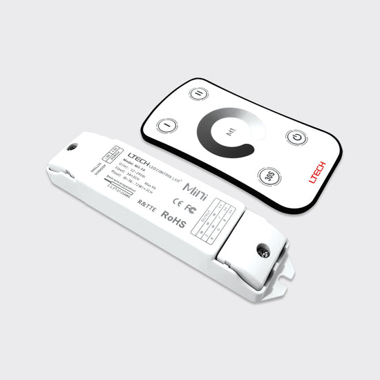Single colour LED ribbon strip dimmer remote with on/off and brightness wheel.