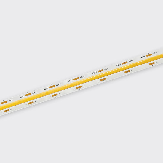 9W/m COB (Chip on Board) LED Ribbon contains a mighty 480 LED chips per metre, all covered by a single line of phosphor, providing dot-free continuous illumination. The small 16.66mm cutting length allows for greater accuracy in installation. With a rating of IP20 it is suitable for general interior applications.