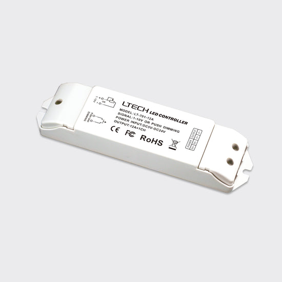 Single-channel PWM output dimming by momentary contact switch (not included).
