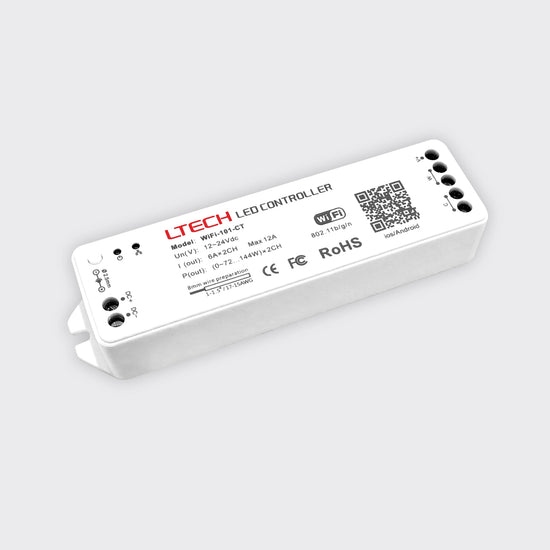 A sophisticated, versatile 2 channel control for tuneable white LED ribbon strip. Connect an iPhone or Android device with Wifi to control lighting systems.