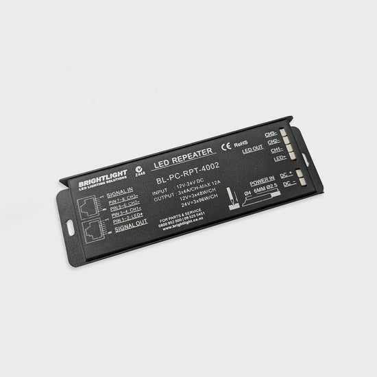 This unit is a 3-channel repeater for expansion of the single colour or RGB linear LED ribbon strip controllers.