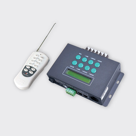Standalone or DMX control for single colour, Tuneable white, and RGB linear LED ribbon strip. The unit can adjust brightness, colour, and the speed of your lighting installation.
