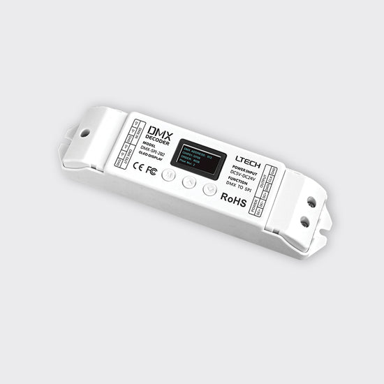 This is a DMX512 to SPI signal LED controller with 16 preset modes and connection via screw terminals.