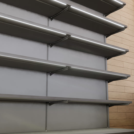 Perfect for retail, Flexi ShelfTrack allows the lighting to easily move along with the shelves anytime product displays are updated.  Simply rotate adaptors to unlock, and reposition the shelf with its LED to ensure consistent lighting in dynamic displays.