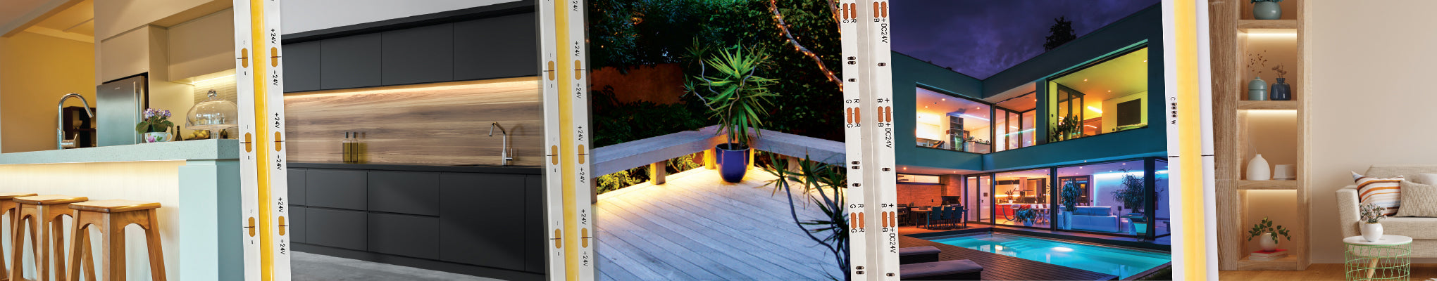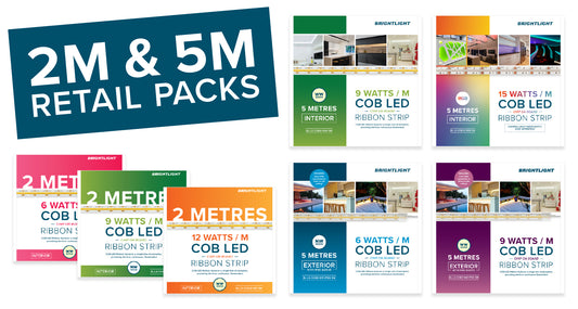 Pre-cut 2m and 5m COB LED retail packs are available from supporting electrical wholesalers in a variety of options. All retail packs come with 500mm tails ready for wiring on-site.