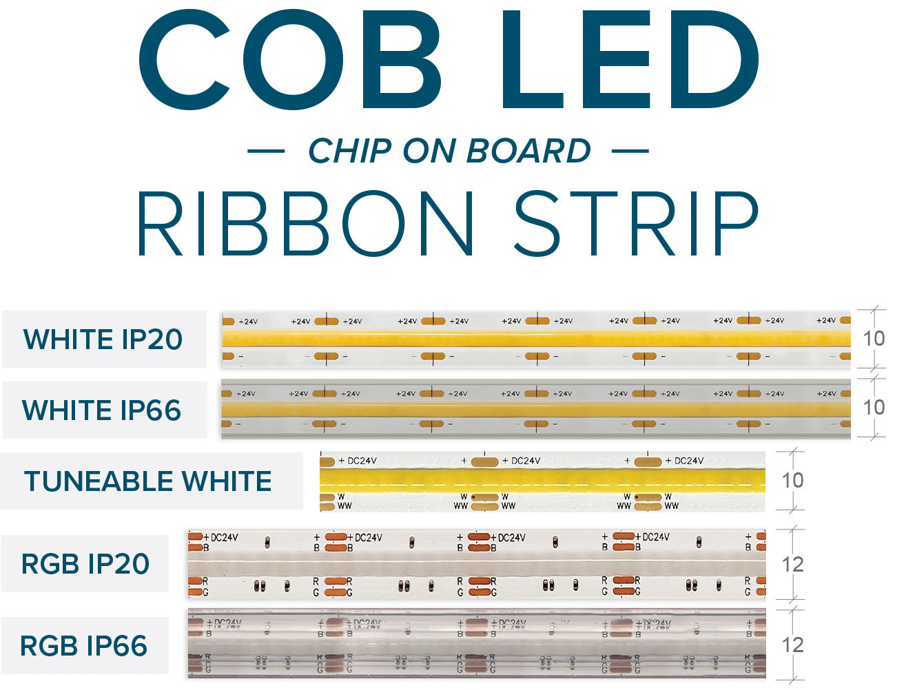An acronym for ‘Chip on Board’, COB LED Ribbon is a leading-edge technology which uses small LED chips mounted directly onto a ‘Printed Circuit Board’ or PCB.