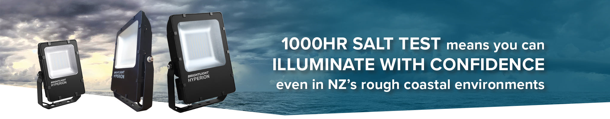 Our range of Hyperion Flood Lights have a black Interpon PZ660 double powder-coat finish making them perfect for the tough New Zealand environment, and were lab tested in a 1000hr / 5yr salt water test to ensure quality.