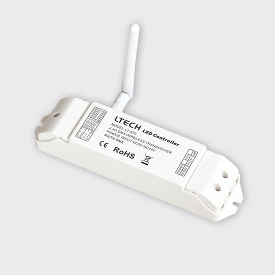 DMX control for single colour, Tuneable white, RGB, and RGBW linear LED ribbon strip or other constant voltage luminaires. The unit will send DMX signal from a single unit and have multiple units receiving with instant, seamless results. It is ideal for retro fit applications where cable installation is a challenge.
